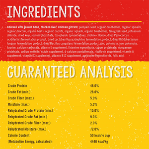 Chicken with ground bone,calcium carbonate,chicken gizzard,chicken liver,choline chloride,copper proteinate,d-calcium pantothenate,dried bacillus coagulans fermentation product,dried bifidobacterium longum fermentation product,dried kelp,dried lactobacillus acidophilus fermentation product,dried pediococcus acidilactici fermentation product,fenugreek seed,folic acid.,iron proteinate,manganese proteinate,niacin supplement,organic beets,organic blueberries,organic broccoli,organic carrots,organic cranberries,organic spinach,organic squash,potassium chloride,pumpkin seed,pyridoxine hydrochloride,riboflavin supplement,salt,sodium phosphate,sodium selenite,taurine,thiamine mononitrate,tocopherols (preservative),vitamin A supplement,vitamin B12 supplement,vitamin D3 supplement,vitamin E supplement,zinc proteinate