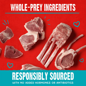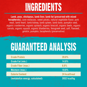 Lamb,cane molasses,chickpeas,fenugreek seed,flaxseed,gelatin,lamb bone,lamb fat (preserved with mixed tocopherols),lamb heart,lamb kidney,lamb liver,lamb spleen,natural vegetable flavor,organic beets,organic blueberries,organic broccoli,organic carrots,organic cranberries,organic spinach,organic squash,peas,pork meal,pumpkin,pumpkin seed,salt,sweet potato,tocopherols (preservative)