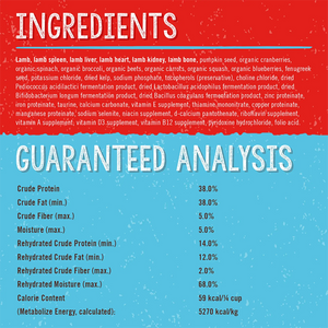 Lamb,calcium carbonate,choline chloride,copper proteinate,d-calcium pantothenate,dried bacillus coagulans fermentation product,dried bifidobacterium longum fermentation product,dried kelp,dried lactobacillus acidophilus fermentation product,dried pediococcus acidilactici fermentation product,fenugreek seed,folic acid.,iron proteinate,lamb bone,lamb heart,lamb kidney,lamb liver,lamb spleen,manganese proteinate,niacin supplement,organic beets,organic blueberries,organic broccoli,organic carrots,organic cranberries,organic spinach,organic squash,potassium chloride,pumpkin seed,pyridoxine hydrochloride,riboflavin supplement,sodium phosphate,sodium selenite,taurine,thiamin mononitrate,tocopherols (preservative),vitamin A supplement,vitamin B12 supplement,vitamin D3 supplement,vitamin E supplement,zinc proteinate