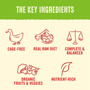 Duck with ground bone,calcium carbonate,choline chloride,copper proteinate,d-Calcium pantothenate,dried bacillus coagulans fermentation product,dried bifidobacterium longum fermentation product,dried kelp,dried lactobacillus acidophilus fermentation product,dried pediococcus acidilactici fermentation product,fenugreek seed,folic acid.,goose,iron proteinate,manganese proteinate,niacin supplement,organic beets,organic blueberries,organic broccoli,organic carrots,organic cranberries,organic spinach,organic squash,potassium chloride,pumpkin seed,pyridoxine hydrochloride,riboflavin supplement,sodium phosphate,sodium selenite,taurine,thiamine mononitrate,tocopherols (preservative),turkey,turkey gizzard,turkey liver,vitamin A supplement,vitamin B12 supplement,vitamin D3 supplement,vitamin E supplement,zinc proteinate