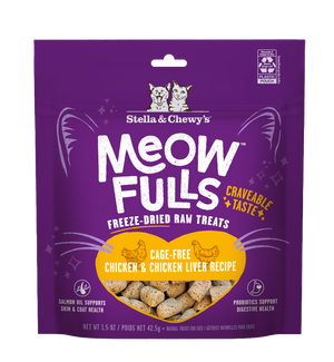 Stella & Chewy's Meowfulls Freeze Dried Cat Treats Chicken & Chicken Liver Recipe pair tasty proteins with purposeful ingredients, creating a craveable, healthy treat your cat will meow for! With added probiotics to help support digestive health, plus salmon oil to help support skin & coat health, you can feel good about treating your cat with Meowfulls.