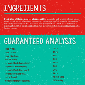 Ground salmon with bones,calcium carbonate,choline chloride,cod liver oil,copper proteinate,d-calcium pantothenate,dried bacillus coagulans fermentation product,dried bifidobacterium longum fermentation product,dried lactobacillus acidophilus fermentation product,dried pediococcus acidilactici fermentation product,fenugreek seed,folic acid.,ground cod with bones,iron proteinate,manganese proteinate,niacin supplement,organic beets,organic blueberries,organic broccoli,organic carrots,organic cranberries,organic spinach,organic squash,potassium chloride,pumpkin seed,pyridoxine hydrochloride,riboflavin supplement,sodium phosphate,sodium selenite,taurine,thiamine mononitrate,tocopherols (preservative),vitamin A supplement,vitamin B12 supplement,vitamin D3 supplement,vitamin E supplement,zinc proteinate