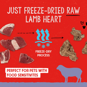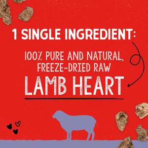 One simple ingredient: 100% pure freeze-dried raw lamb heart. Made in the USA. A natural, healthy, high-value treat that dogs cannot resist!