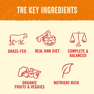Beef,beef bone,beef heart,beef kidney,beef liver,beef tripe,calcium carbonate,choline chloride,copper proteinate,d-calcium pantothenate,dried Bacillus coagulans fermentation product,dried Bifidobacterium longum fermentation product,dried Lactobacillus acidophilus fermentation product,dried Pediococcus acidilactici fermentation product,dried kelp,fenugreek seed,folic acid.,iron proteinate,manganese proteinate,niacin supplement,organic beets,organic blueberries,organic broccoli,organic carrots,organic cranberries,organic spinach,organic squash,potassium chloride,pumpkin seed,pyridoxine hydrochloride,riboflavin supplement,sodium phosphate,sodium selenite,taurine,thiamine mononitrate,tocopherols (preservative),vitamin A supplement,vitamin B12 supplement,vitamin D3 supplement,vitamin E supplement,zinc proteinate