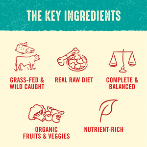 Beef,beef heart,beef liver,calcium carbonate,choline chloride,copper proteinate,d-calcium pantothenate,dried Bacillus coagulans fermentation product,dried Bifidobacterium longum fermentation product,dried Lactobacillus acidophilus fermentation product,dried Pediococcus acidilactici fermentation product,dried kelp,fenugreek seed,folic acid.,iron proteinate,manganese proteinate,niacin supplement,organic beets,organic blueberries,organic broccoli,organic carrots,organic cranberries,organic spinach,organic squash,potassium chloride,pumpkin seed,pyridoxine hydrochloride,riboflavin supplement,sodium phosphate,sodium selenite,taurine,thiamine mononitrate,tocopherols (preservative),vitamin A supplement,vitamin B12 supplement,vitamin E supplement,whole ground salmon,zinc proteinate