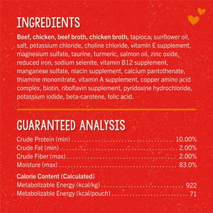 Beef,beef broth,beta-carotene,biotin,calcium pantothenate,chicken,chicken broth,choline chloride,copper amino acid complex,folic acid,magnesium sulfate,manganese sulfate,niacin supplement,potassium chloride,potassium iodide,pyridoxine hydrochloride,reduced iron,riboflavin supplement,salmon oil,salt,sodium selenite,sunflower oil,tapioca,taurine,thiamine mononitrate,turmeric,vitamin A supplement,vitamin B12 supplement,vitamin E supplement,zinc oxide