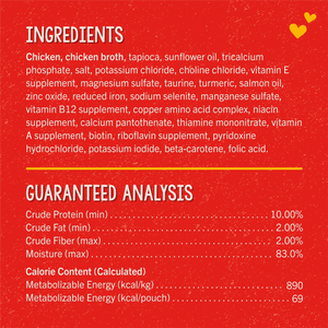 Chicken,beta-carotene,biotin,calcium pantothenate,chicken broth,choline chloride,copper amino acid complex,folic acid,magnesium sulfate,manganese sulfate,niacin supplement,potassium chloride,potassium iodide,pyridoxine hydrochloride,reduced iron,riboflavin supplement,salmon oil,salt,sodium selenite,sunflower oil,tapioca,taurine,thiamine mononitrate,tricalcium phosphate,turmeric,vitamin A supplement,vitamin B12 supplement,vitamin E supplement,zinc oxide