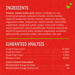 Chicken,beta-carotene,biotin,calcium pantothenate,chicken broth,choline chloride,copper amino acid complex,duck,folic acid,magnesium sulfate,manganese sulfate,niacin supplement,potassium chloride,potassium iodide,pyridoxine hydrochloride,reduced iron,riboflavin supplement,salmon oil,salt,sodium selenite,sunflower oil,tapioca,taurine,thiamine mononitrate,tricalcium phosphate,turmeric,vitamin A supplement,vitamin B12 supplement,vitamin E supplement,zinc oxide