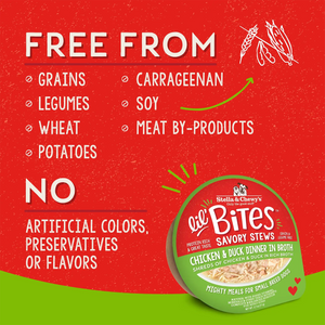 Free from grains, legumes, potatoes, carrageenan, wheat, meat by-products, soy, artificial colors, preservatives & flavors