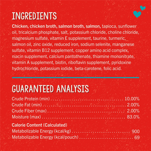 Chicken,beta-carotene,biotin,calcium pantothenate,chicken broth,choline chloride,copper amino acid complex,folic acid,magnesium sulfate,manganese sulfate,niacin supplement,potassium chloride,potassium iodide,pyridoxine hydrochloride,reduced iron,riboflavin supplement,salmon,salmon broth,salmon oil,salt,sodium selenite,sunflower oil,tapioca,taurine,thiamine mononitrate,tricalcium phosphate,turmeric,vitamin A supplement,vitamin B12 supplement,vitamin E supplement,zinc oxide