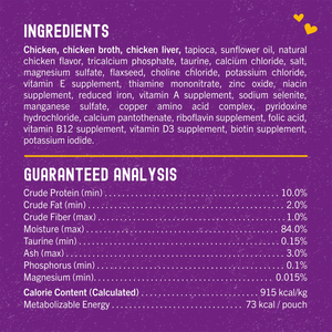 Biotin).,Calcium Chloride,Chicken,Chicken Broth,Chicken Liver,Choline Chloride,Copper Amino Acid Complex,Flaxseed,Folic Acid,Magnesium Sulfate,Manganese Sulfate,Minerals (Zinc Oxide,Natural Chicken Flavor,Niacin Supplement,Potassium Chloride,Potassium Iodide),Pyridoxine Hydrochloride,Reduced Iron,Riboflavin Supplement,Salt,Sodium Selenite,Sunflower Oil,Tapioca,Taurine,Thiamine Mononitrate,Tricalcium Phosphate,Vitamin A Supplement,Vitamin B12 Supplement,Vitamin D3 Supplement,Vitamins (Vitamin E Supplement,d-Calcium Pantothenate