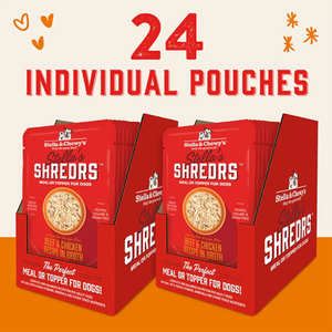 Kickstart your dog’s dinner with Stella’s Shredrs — a delicious and nutritious way to make mealtime special. Packed with protein and nutrition, we combine pure shredded and diced muscle meat with a rich nutritious broth for a healthy way to boost your pup’s bowl! This convenient, tear open pouch is ready-to-use anytime as the perfect food topper or a delectable complete & balanced meal all on its own.