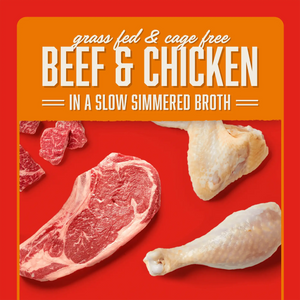 Real shredded muscle meat and diced meat in a slowly simmered broth