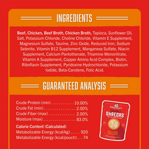 Beef,beef broth,beta-carotene,biotin,calcium pantothenate,chicken,chicken broth,choline chloride,copper amino acid complex,folic acid,magnesium sulfate,manganese sulfate,niacin supplement,potassium chloride,potassium iodide,pyridoxine hydrochloride,reduced iron,riboflavin supplement,salt,sodium selenite,sunflower oil,tapioca,taurine,thiamine mononitrate,vitamin A supplement,vitamin B12 supplement,vitamin E supplement,zinc oxide