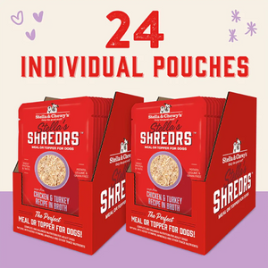 Kickstart your dog’s dinner with Stella’s Shredrs — a delicious and nutritious way to make mealtime special. Packed with protein and nutrition, we combine pure shredded and diced muscle meat with a rich nutritious broth for a healthy way to boost your pup’s bowl! This convenient, tear open pouch is ready-to-use anytime as the perfect food topper or a delectable complete & balanced meal all on its own.