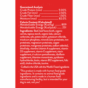 Beef,beef bone broth,biotin,calcium carbonate,choline chloride,copper proteinate,d-calcium pantothenate,dried kelp,folic acid).,iron proteinate,magnesium proteinate,manganese proteinate,minerals (zinc proteinate,niacin supplement,organic carrots,organic kale,potassium chloride,potato starch,pyridoxine hydrochloride,riboflavin supplement,salt,selenium yeast),tapioca starch,thiamine mononitrate,tricalcium phosphate,vitamin B12 supplement,vitamin D3 supplement,vitamin E supplement,vitamins (vitamin A supplement