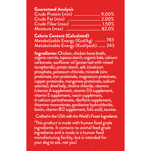 Chicken,biotin,calcium carbonate,chicken bone broth,choline chloride,copper proteinate,d-calcium pantothenate,dried kelp,folic acid).,iron proteinate,magnesium proteinate,manganese proteinate,minerals (zinc proteinate,niacin supplement,organic carrots,organic kale,potassium chloride,potato starch,pyridoxine hydrochloride,riboflavin supplement,salt,selenium yeast),sunflower oil (preserved with mixed tocopherols),tapioca starch,thiamine mononitrate,tricalcium phosphate,vitamin B12 supplement,vitamin D3 supplement,vitamin E supplement,vitamins (vitamin A supplement