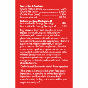 Beef,beef bone broth,biotin,calcium carbonate,choline chloride,copper proteinate,d-calcium pantothenate,dried kelp,elk,folic acid).,iron proteinate,lamb,magnesium proteinate,manganese proteinate,minerals (zinc proteinate,niacin supplement,organic kale,potassium chloride,potato starch,pyridoxine hydrochloride,riboflavin supplement,salt,selenium yeast),tapioca starch,thiamine mononitrate,tricalcium phosphate,vitamin B12 supplement,vitamin D3 supplement,vitamin E supplement,vitamins (vitamin A supplement