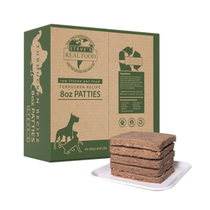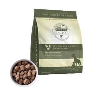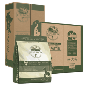 Steve’s Real Food frozen turducken raw pet food blends the flavors and nutrients of turkey, duck, and chicken, offering a delectable medley of poultry meats for your pet to enjoy. It’s a highly palatable raw recipe that has wide-ranging nutritional benefits. It is made from vegetarian-fed, free-range poultry, complete and balanced for all stages of life, and is species-appropriate for dogs and cats. The turducken recipe is a BARF formulation composed of 80% meat/organ/bone, 15% produce, and 5% value-added ingredients such as New Zealand Green Lipped Mussel, coconut oil, and raw goat milk.