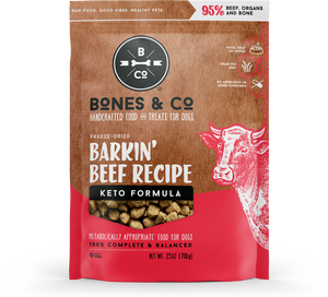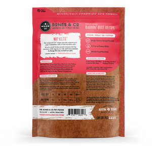 Freeze-dried dog food made with 95% beef, organs and bone, and a 1:1 fat-to-protein ratio for metabolically appropriate, 100% complete and balanced canine nutrition. Grass-fed beef raised without antibiotics or added hormones.