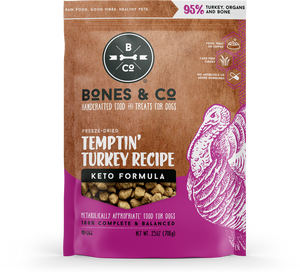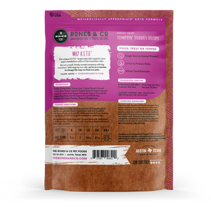Freeze-dried dog food made with 95% turkey, organs and bone, and a 1:1 fat-to-protein ratio for metabolically appropriate, 100% complete and balanced canine nutrition. Cage-free turkey raised without antibiotics or added hormones.
