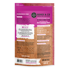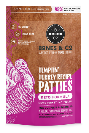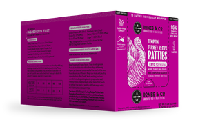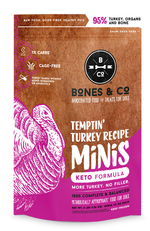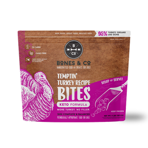 Packed with the wholesome benefits of cage-free, human-grade turkey, this complete and balanced, turkey raw dog food is crafted from 95% turkey, organs and bone, and less than 1% carbohydrates. With a unique, keto formula featuring a 1:1 fat-to-protein ratio, we make it simple to feed your pup metabolically appropriate, raw dog food. Turkey raised without added hormones or antibiotics.