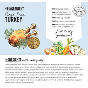 Turkey, potatoes, peas, lentils, carrots, eggs, ground flaxseed, turkey liver, broccoli, pumpkin, apples, coconut oil, natural turkey flavor, salmon oil, kale, chia seed, minerals [tricalcium phosphate, sodium chloride, iron amino acid chelate, copper amino acid chelate, manganese amino acid chelate, zinc amino acid chelate, sodium selenite], fenugreek seed, dried kelp, taurine, vitamins [vitamin A supplement, vitamin D3 supplement, vitamin E supplement, thiamine mononitrate (vitamin B1), riboflavin (vitamin B2), calcium pantothenate (vitamin B5), pyridoxine hydrochloride (vitamin B6), folic acid, vitamin B12 supplement, niacin supplement], mixed tocopherols, turmeric, dried bacillus coagulans fermentation product, rosemary extract.