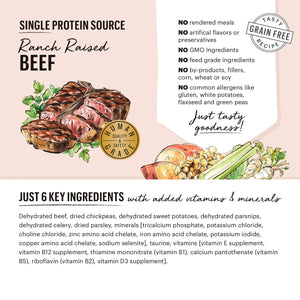 Dehydrated beef, dried chickpeas, dehydrated sweet potatoes, dehydrated parsnips, dehydrated celery, dried parsley, minerals [tricalcium phosphate, potassium chloride, choline chloride, zinc amino acid chelate, iron amino acid chelate, potassium iodide, copper amino acid chelate, sodium selenite], taurine, vitamins [vitamin E supplement, vitamin B12 supplement, thiamine mononitrate (vitamin B1), calcium pantothenate (vitamin B5), riboflavin (vitamin B2), vitamin D3 supplement].