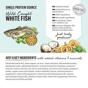 Dehydrated white fish, dried organic coconut, dried chickpeas, dehydrated pumpkin, dehydrated celery, dehydrated spinach, minerals [tricalcium phosphate, potassium chloride, choline chloride, zinc amino acid chelate, iron amino acid chelate, potassium iodide, copper amino acid chelate, sodium selenite], taurine, vitamins [vitamin E supplement, vitamin B12 supplement, thiamine mononitrate (vitamin B1), calcium pantothenate (vitamin B5), riboflavin (vitamin B2), vitamin D3 supplement].