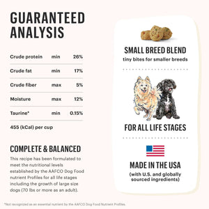 This complete and balanced dry dog food was specially created for small breed dogs of all life stages. It even includes an extra boost of L-carnitine, to help support healthy metabolism. L-carnitine, also known as levocarnitine, is a naturally occurring amino acid structure that the body produces. An extra boost of omega fatty acids from salmon oil is also included, to help support better skin and coat health.