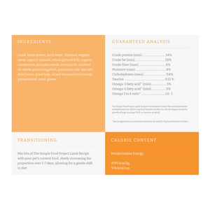 Lamb, lamb spleen, lamb heart, flaxseed, organic yams, organic spinach, whole ground krill, organic cranberries, pumpkin seeds, coconut oil, cod liver oil, whole ground eggshell, potassium salt, sea salt, dried yeast, dried kelp, mixed tocopherols (natural preservative), mint, guava