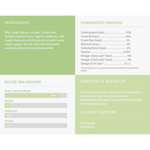 Wild-caught salmon, chicken, chicken liver, flaxseed, chicken hearts, organic cranberries, wild- caught whole ground krill, ground pumpkin seeds, organic ginger, sea salt, dried kelp, dried yeast,