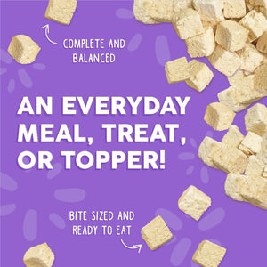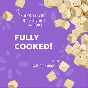 Gently cooked with 96% boneless, skinless chicken breast and 0% bones or organs, our fully cooked freeze dried is packed with flavor so flavorful your cat will freak! Bite-sized and ready to eat, our gently cooked cubes make mealtime effortless and irresistible while providing safe, worry-free handling and trusted nutrition.