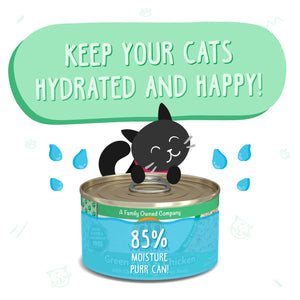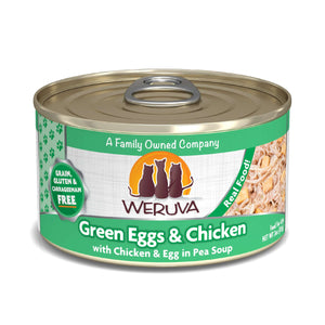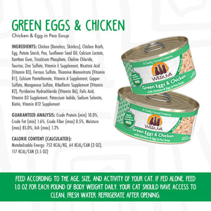 Fuel your little carnivore’s adventures with the Weruva Green Eggs & Chicken with Chicken, Egg & Greens in Gravy Grain-Free Canned Cat Food. Made with lean chicken, eggs and peas as the first ingredients, every juicy bite is loaded with the meat your pal craves, and all the protein he needs for healthy muscles. Since it’s formulated with a perfectly-balanced blend of vitamins, minerals and heart-healthy taurine, every easy-open, BPA-free can is actually a complete meal—on its own or as a tasty kibble topper. Your kitty will love the meaty morsels and luscious gravy that also provides plenty of hydration so he can stay healthy, from nose to tail. It’s no wonder that for cats everywhere, Weruva is also known as “the best cat food under the sun!”