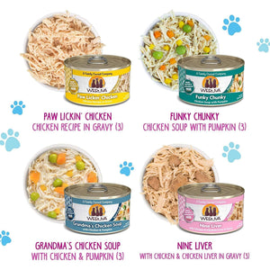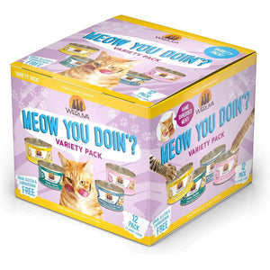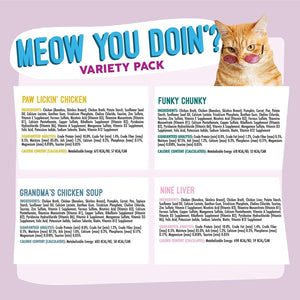 The Meow You Doin'? 3.0 oz Variety Pack includes the following flavors: Paw Lickin’ Chicken, Grandma’s Chicken Soup, Funky Chunky and Amazon Livin'