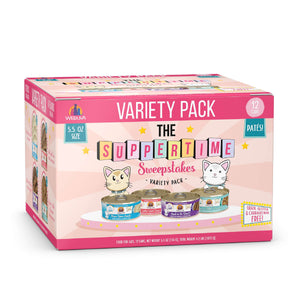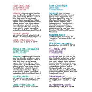 The Suppertime Sweepstakes 3.0 oz Variety Pack includes the following flavors: Press Your Lunch!, Jolly Good Fares, Meal or No Deal! and Meows n' Holler PurrAmid