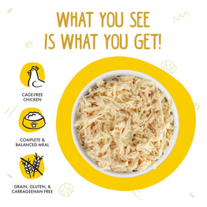 Chicken (Boneless, Skinless Breast), Chicken Broth, Sunflower Seed Oil, Potato Starch, Tricalcium Phosphate, Xanthan Gum, Choline Chloride, Zinc Sulfate, Vitamin E Supplement, Ferrous Sulfate, Thiamine Mononitrate (Vitamin B1), Nicotinic Acid (Vitamin B3), Calcium Pantothenate, Vitamin A Supplement, Potassium Iodide, Manganese Sulfate, Copper Sulfate, Riboflavin Supplement (Vitamin B2), Pyridoxine Hydrochloride (Vitamin B6), Folic Acid, Vitamin D3 Supplement, Vitamin B12 Supplement