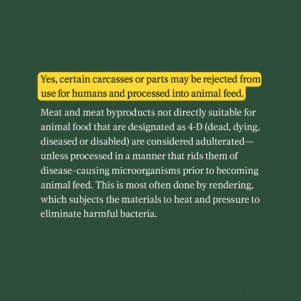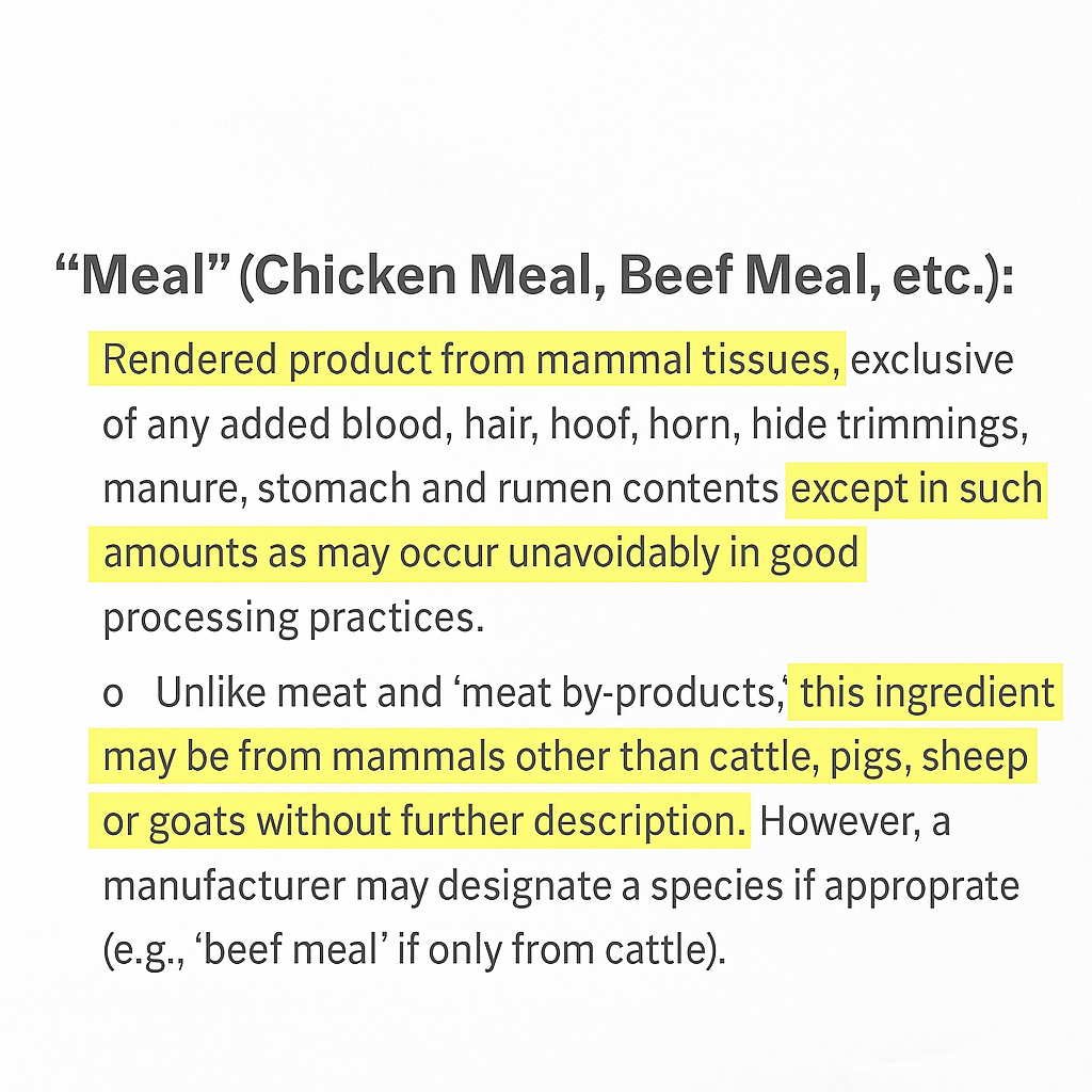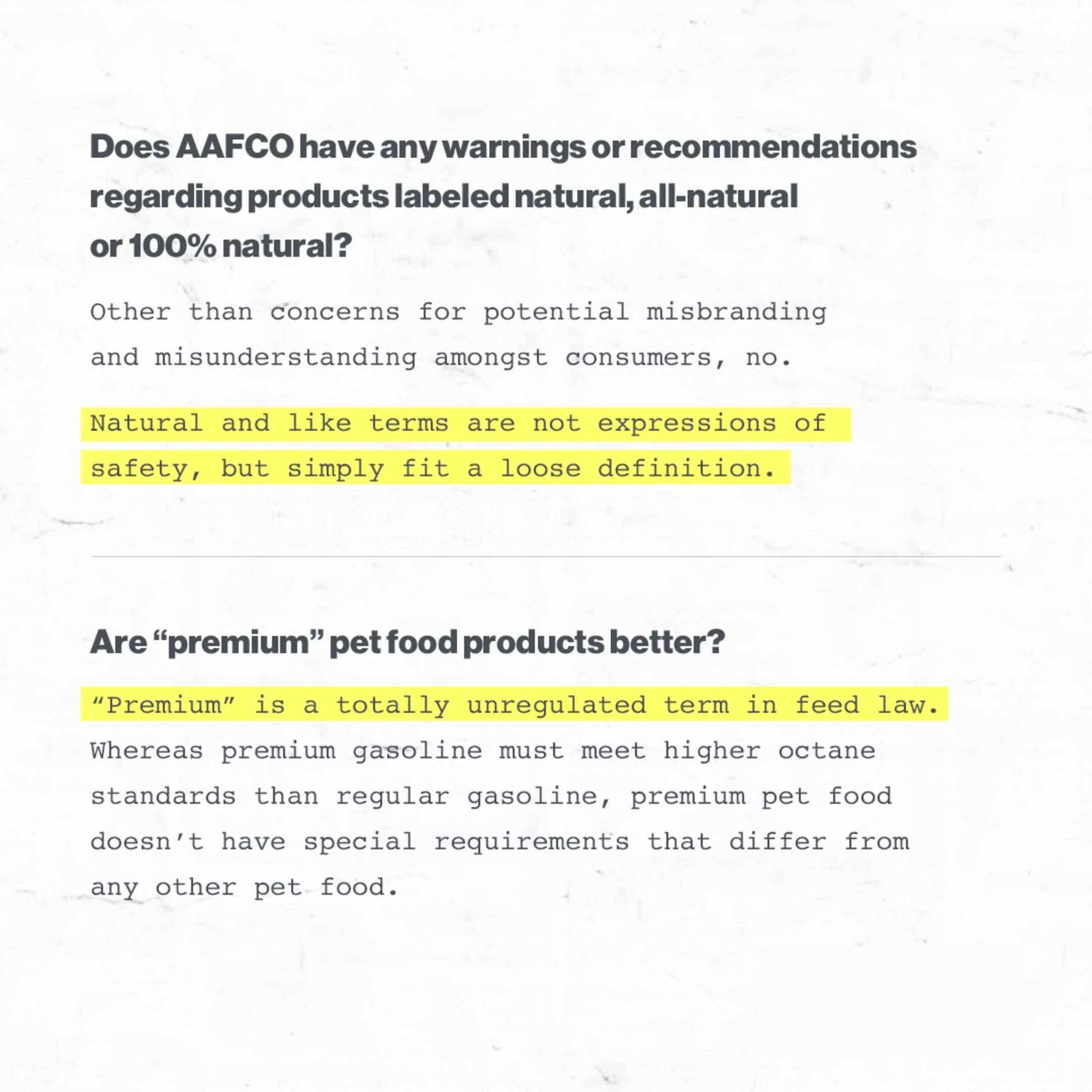 After being turned into rendered products like “beef meal,” these instead are the “fresh” cuts of meat we see on bags of pet food. The worst part? Regulators allow this to be labeled “premium” “super premium”, and “natural.”