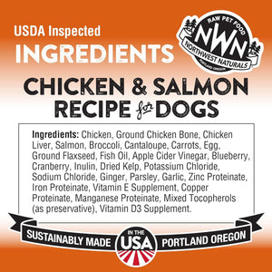 Chicken, Ground Chicken Bone, Chicken Liver, Salmon, Broccoli, Cantaloupe, Carrots, Egg, Ground Flaxseed, Fish Oil*, Apple Cider Vinegar, Blueberry, Cranberry, Inulin, Dried Kelp, Potassium Chloride, Sodium Chloride, Ginger, Parsley, Garlic, Zinc Proteinate, Iron Proteinate, Vitamin E Supplement, Copper Proteinate, Manganese Proteinate, Mixed Tocopherols (as preservative), Vitamin D Supplement.
